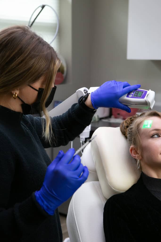 Before beginning an injectable treatment, the AccuVein® device is passed over the patient’s desired treatment area. This device emits infrared light that is absorbed by the hemoglobin in the blood. As the blood absorbs this hemoglobin, the vessels and veins below the surface of the skin appear noticeably different than the surrounding tissue. This allows our injectors to select injection sites that skillfully avoid the delicate blood vessels in the area. While AccuVein® cannot eliminate instances of post-treatment bruising altogether, it does dramatically decrease the chances of its occurrence.